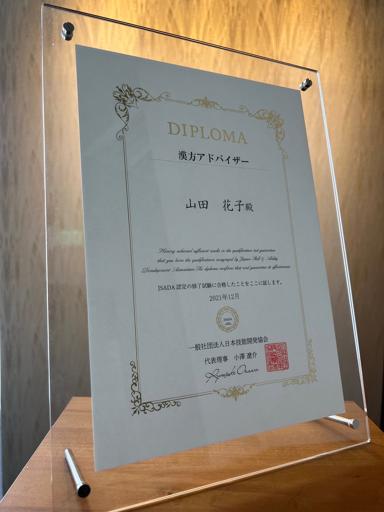 証書ケースやアクリル製スタンドが付属したコースをご選択頂きますと、認定書をセットした状態でお手元にお届けいたします!